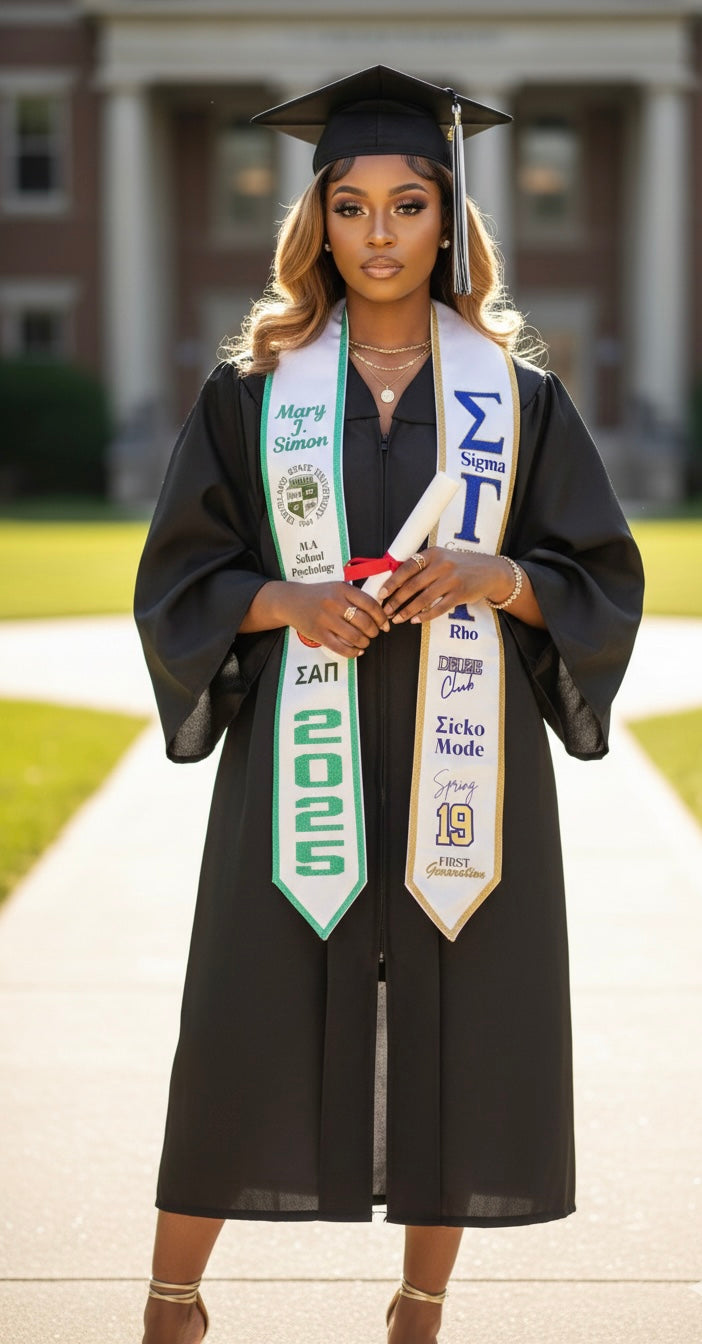 Not only are our stoles a stylish addition to your graduation attire, but they are also a memorable keepsake that you can cherish for years to come. Whether you want to commemorate your academic achievements or show solidarity with your sorority or fraternity, our personalized stoles are the perfect way to do so.